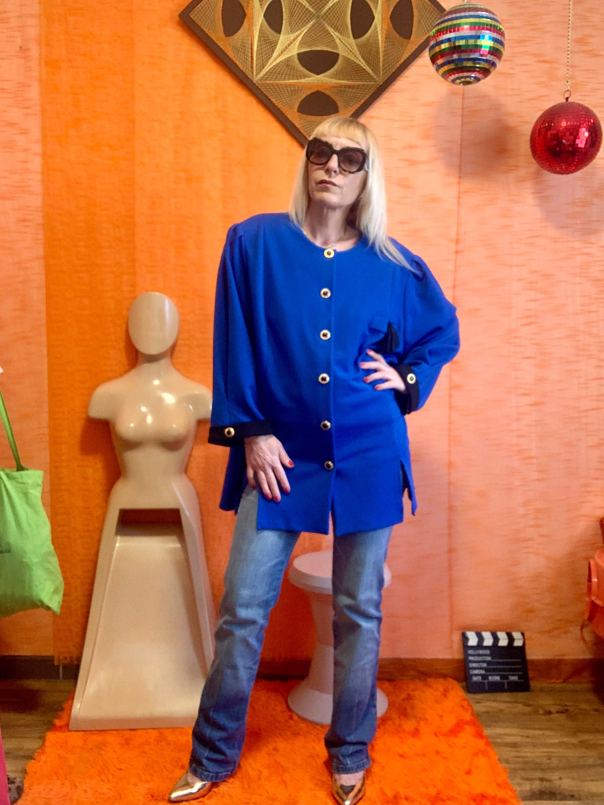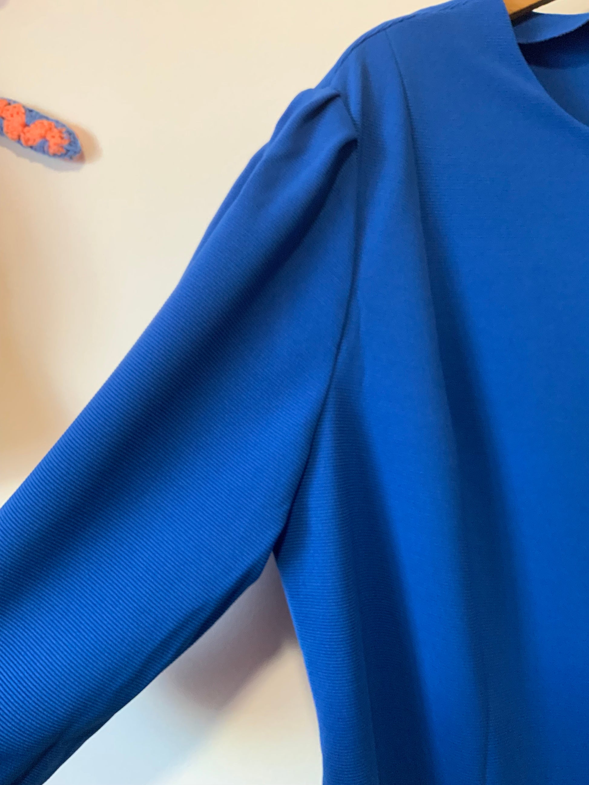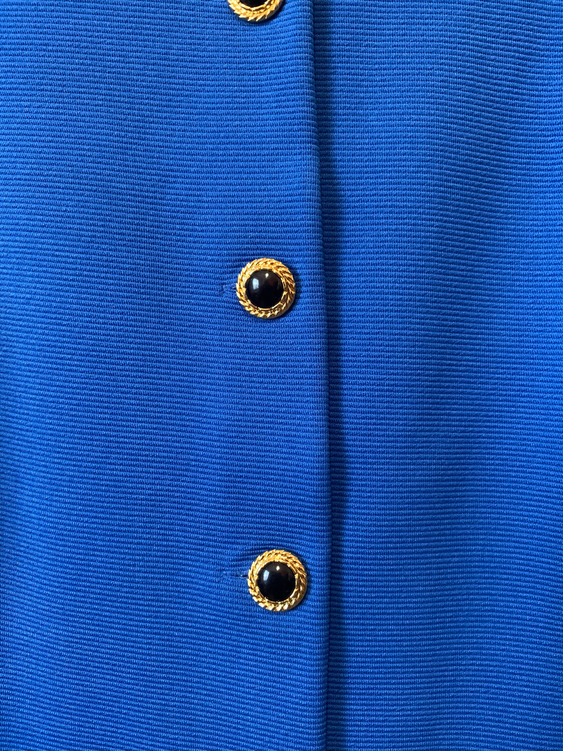 Veste Blazer Vintage France 1980/90 Bleu électrique Avec boutons magnifiques et épaules à volume plissé avec épaulettes - État excellent, 100% polyester.